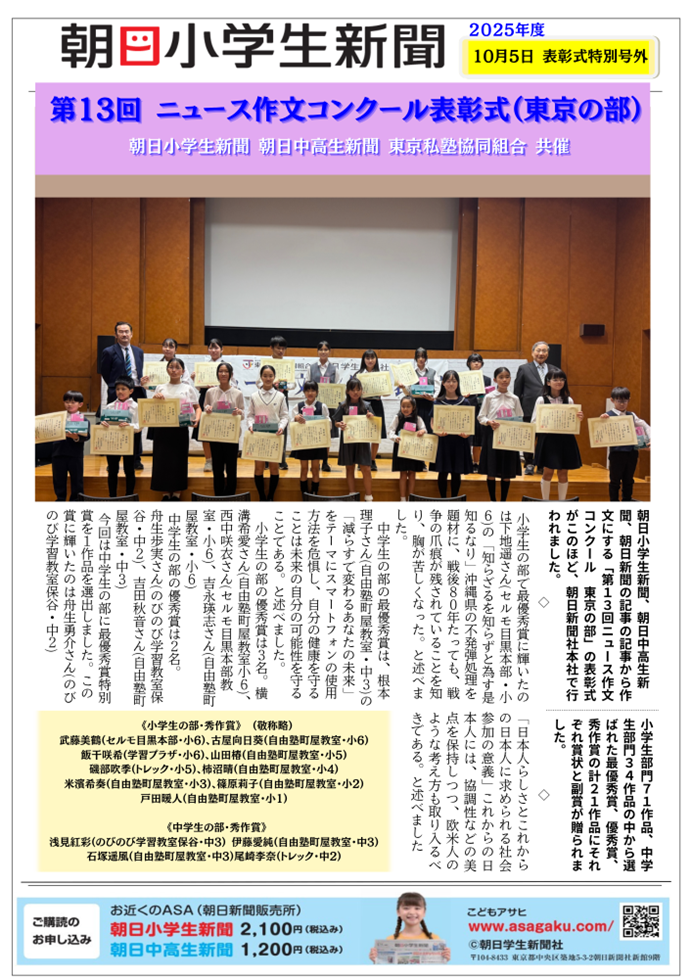 作文講座受講生の最優秀賞受賞作品が朝日小学生新聞に全文掲載されました!!