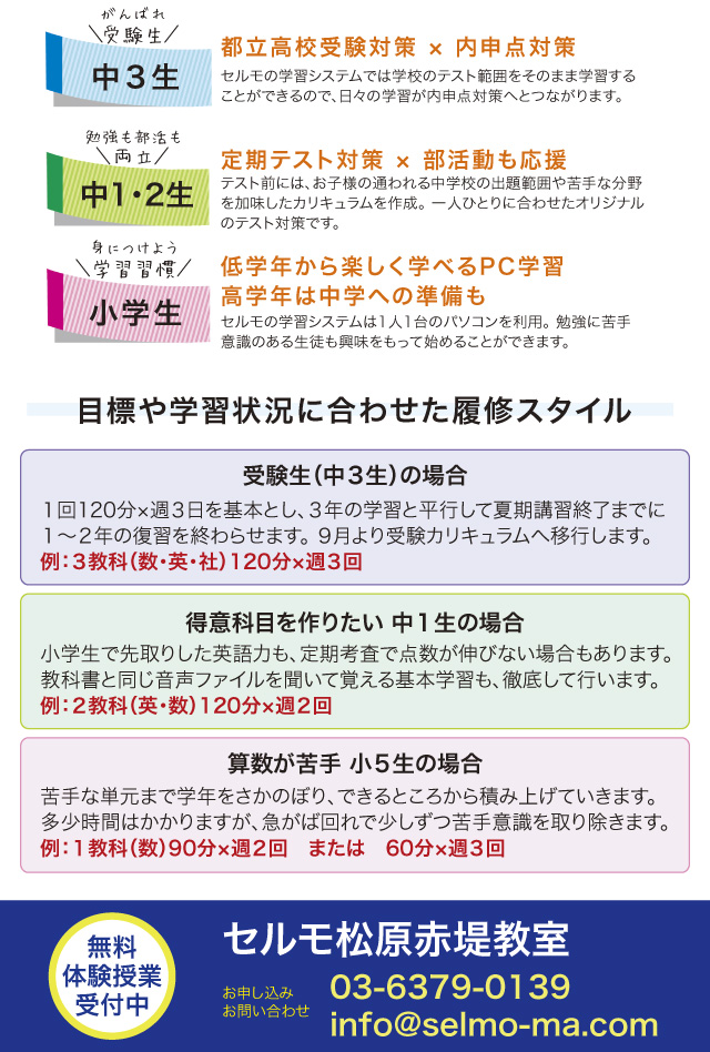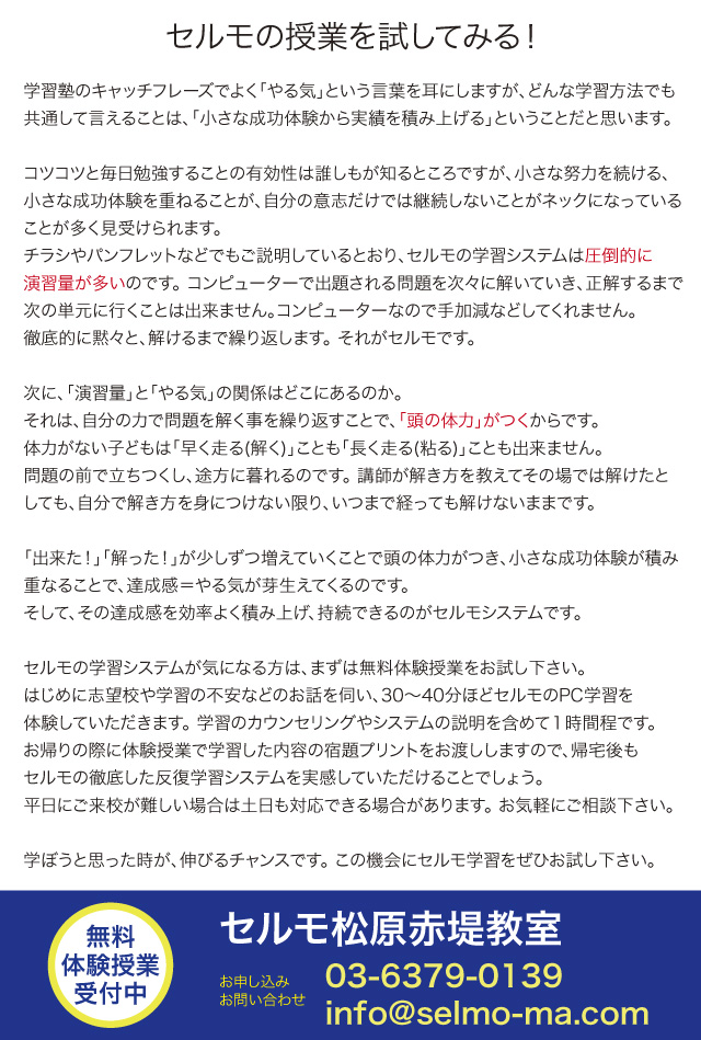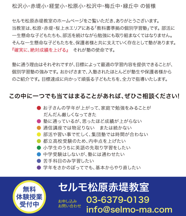 | 営業時間 : | (月)〜(金) 15:30~21:30 土曜日は受験生のための講習を不定期開催 問合せ可能時間は(月)~(金)の14:00~20:00 |