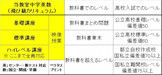 中学受験だけでしか使われることのない線分図・面積図等では教えません。都立および国私立受験両方に通用する「和田秀樹方式(算数の方程式解法)」を採用し、飛び級カリキュラムを履修します。中学を修了した学生の実力レベルで中学入試問題を解きます。こうすれば、中学入学後に部活をやっていても上位の成績に。このカリキュラムは受験の有無に関係なく履修できます。