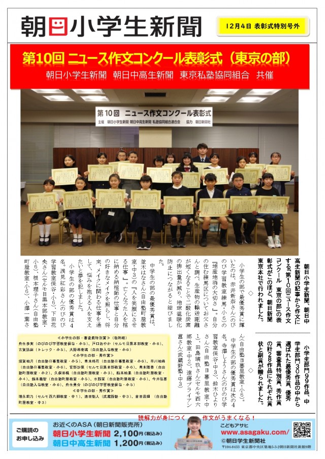 作文講座受講生の最優秀賞受賞作品が朝日小学生新聞に全文掲載されました!!