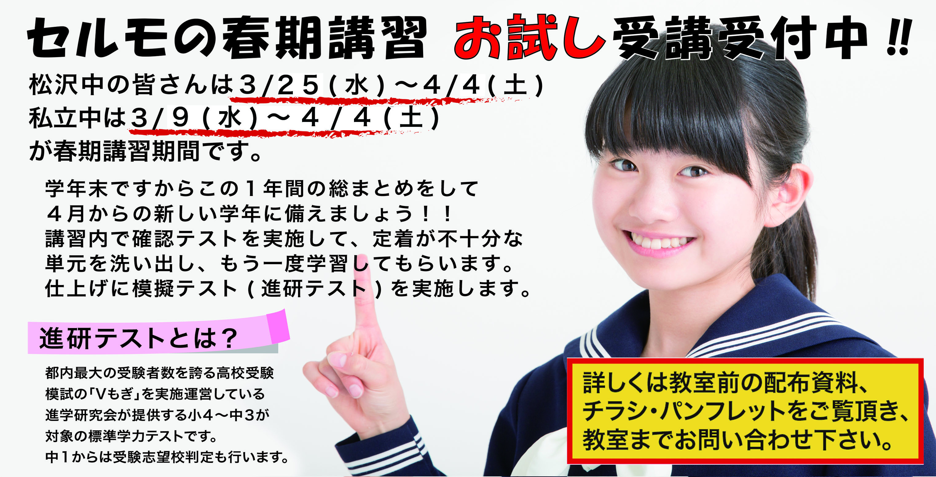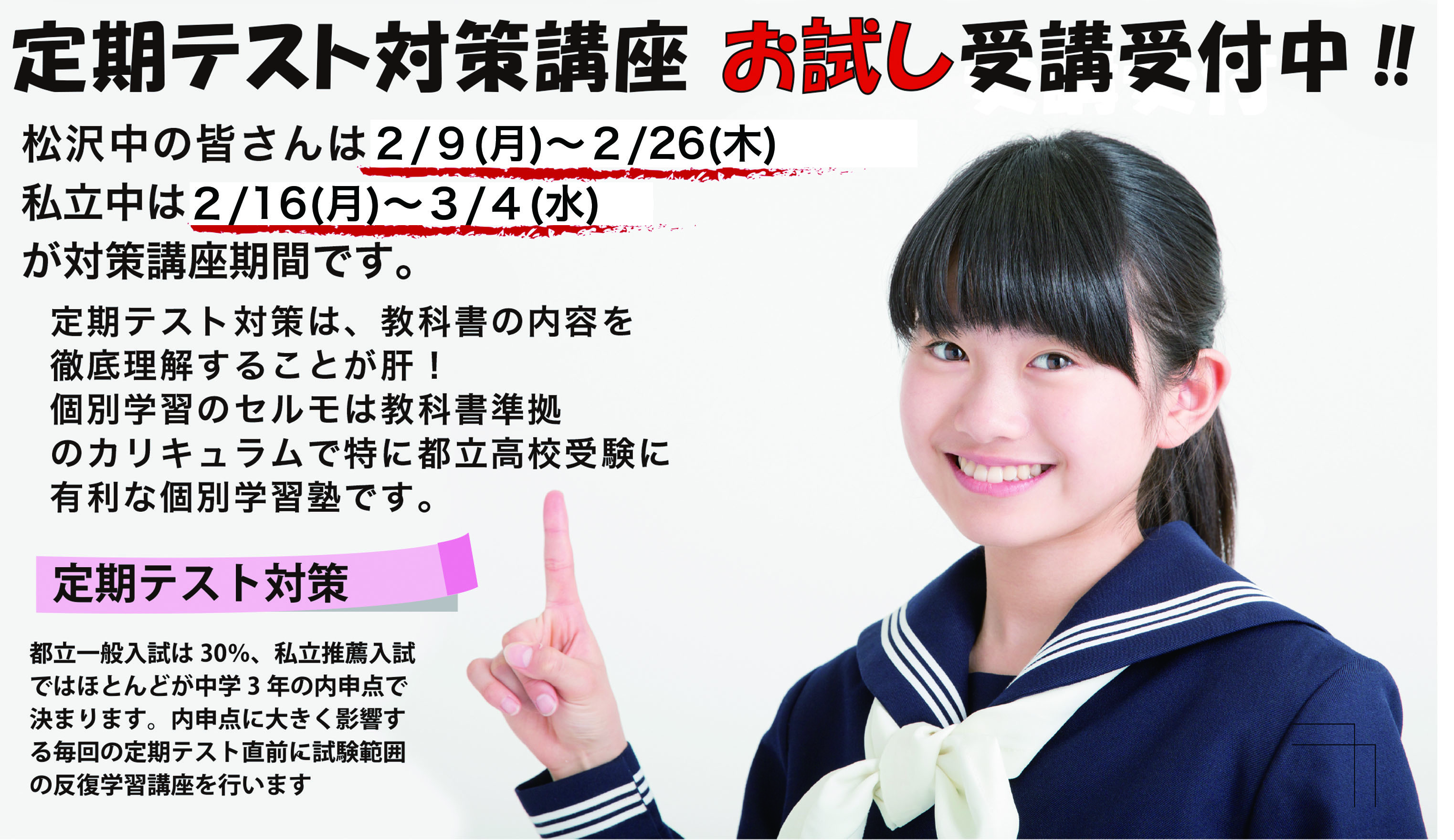| 営業時間 : | (月)〜(金) 15:30~21:30 土曜日は受験生のための講習を不定期開催 問合せ可能時間は(月)~(金)の14:00~20:00 |
