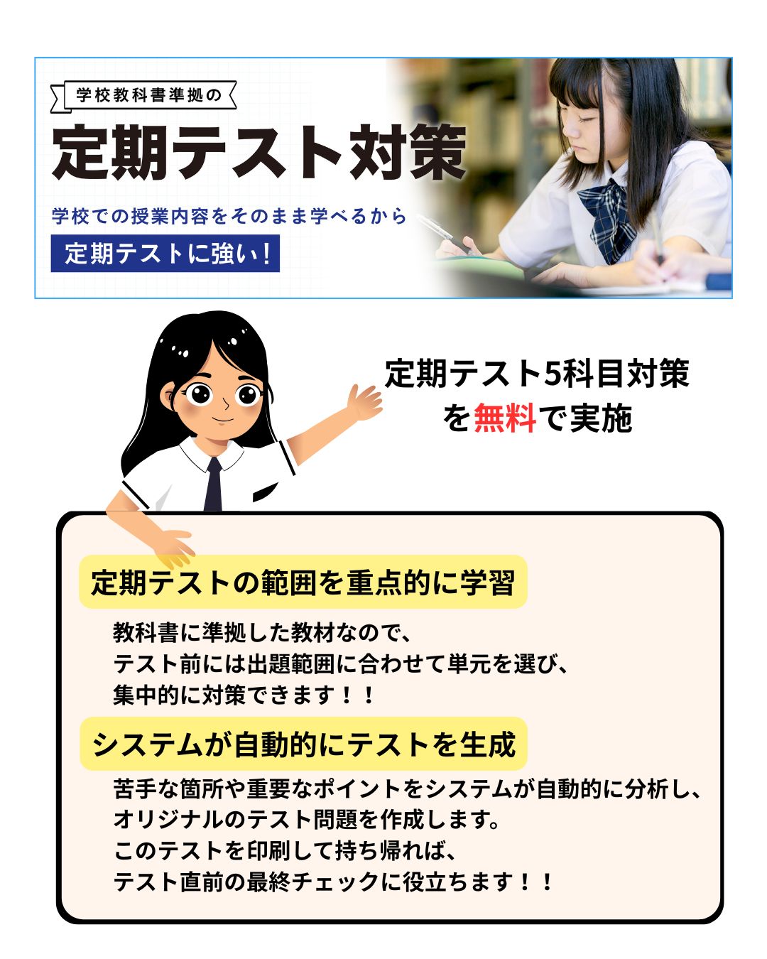 定期テスト5科目対策を無料で実施しています。