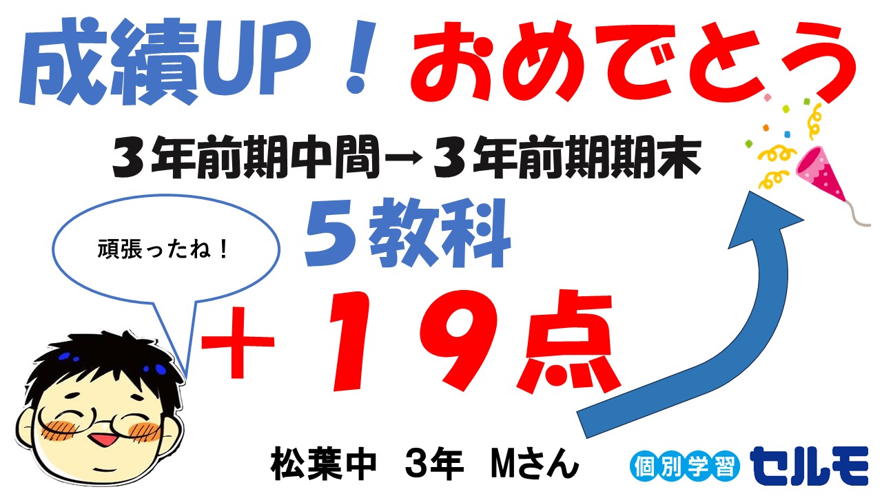 成績UPの続報が届きました!同じく松葉中学校3年生Mさんは、前期期末テストにおいて5教科で前回比+19点の成績アップを実現。学年順位も3教科で228人中17位という好成績を獲得しました。MさんもT君と同様に、セルモの通常授業に加え、夏期講習を受講し、期末テストと高校受験に備えました!コツコツ頑張り屋のMさん。苦手だった数学も、いまでは、得意科目に変身。これからもセルモは応援します。
