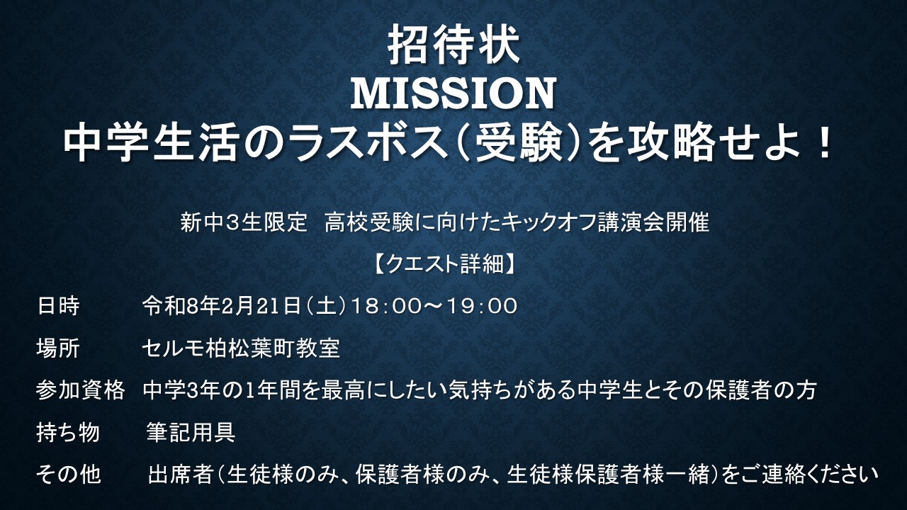個別学習のセルモ柏松葉町教室において、上記講演会を実施します。例年、セルモ通塾生のみを対象としておりましたが、今年は、セルモ通塾生以外の方の参加もお待ちしています。中学3年生になるにあたっての心構え、志望校の選び方など、高校受験に向けて心が熱くなること間違いなしの1時間。参加費は無料です。お気軽にお問合せください。