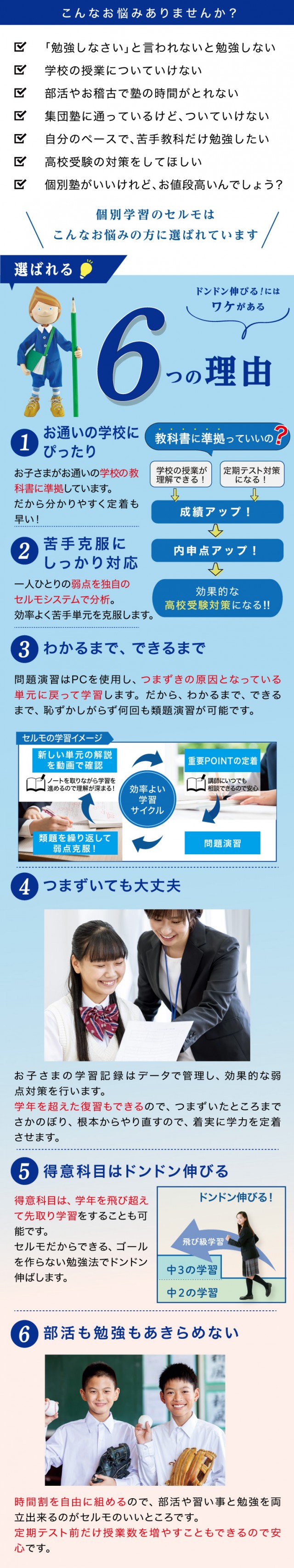 セルモシステムでの学習は、お子さまに合わせた学習ができるという個別指導のメリットに加え、担当講師ごとのレベルに依存した授業ではなく、磨き抜かれた高品質な授業内容を繰り返し確認することができるため、個別指導の特性を持ちながらも自分自身の力で考え、答えを導き出せるようにします。さらに教室長がお子さまの学習状況を徹底して見守ることにより、自立心を育てながら学習効果を上げることができます。