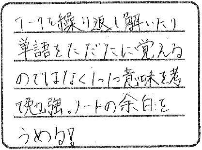 学校指定のワークの対策を、重点的に指導した結果、その成果を実感できたと言ってくれる生徒が多く見られました。