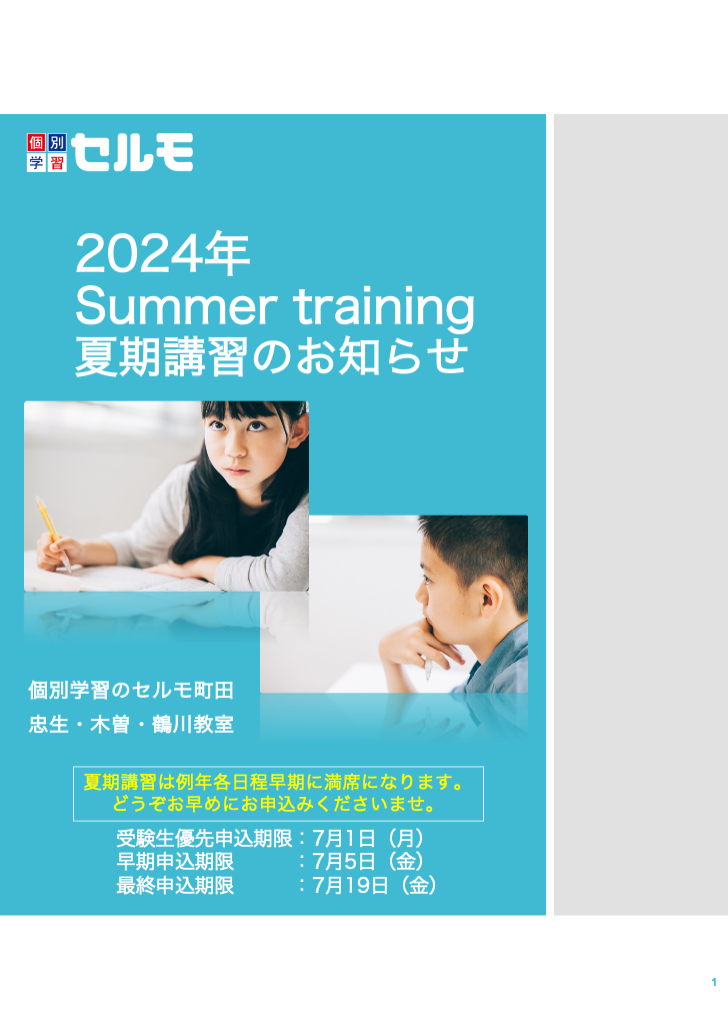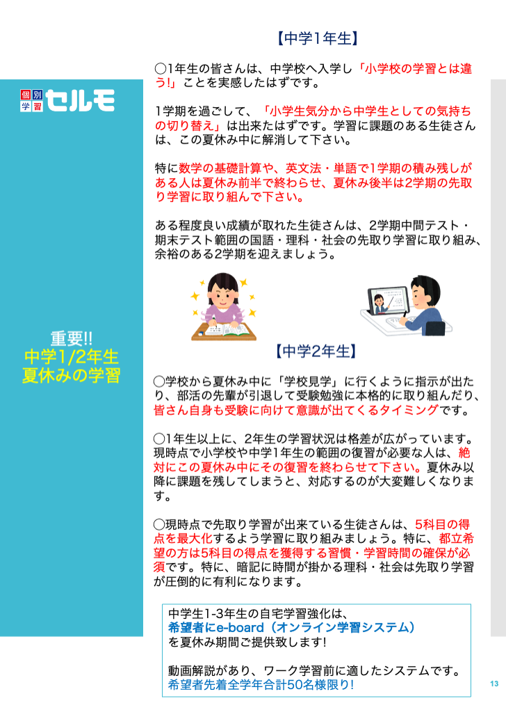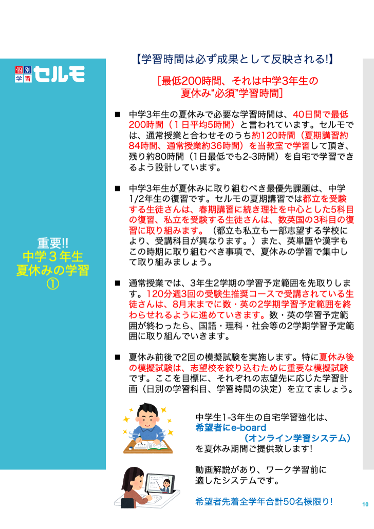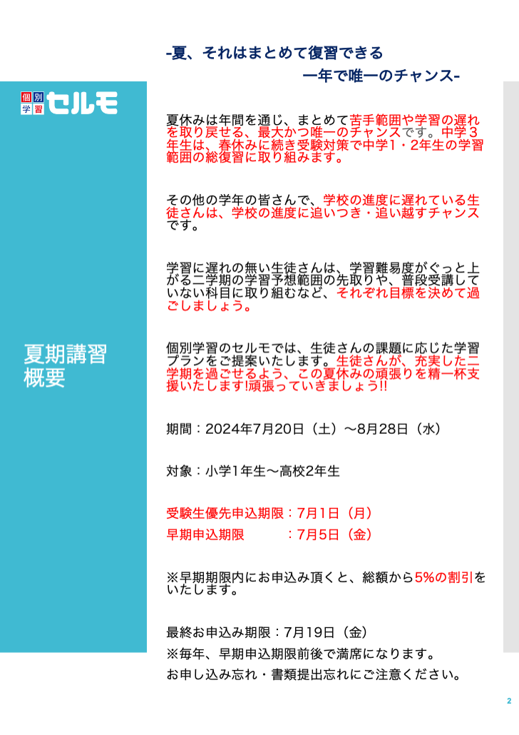 | 備考 : | ―2024年 個別学習のセルモ― ―夏期講習のご案内― セルモの体験や季節講習が初めての方なら、8回800分パックを特別価格で受講可能です! ※小学校1年生〜中学2年生の特別価格 生徒さんの課題に合わせたきめ細やかな全27の推奨コースをご用意しています。 圧倒的演習量で、この夏劇的変化を目指しましょう。 学習量=学力は否定出来ない事実、どなたでも楽しく集中して学習出来る個別学習のセルモが学習課題の解決をお手伝いします!! |