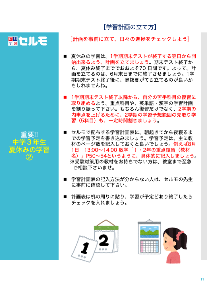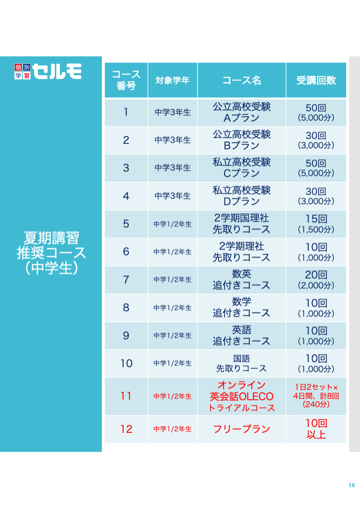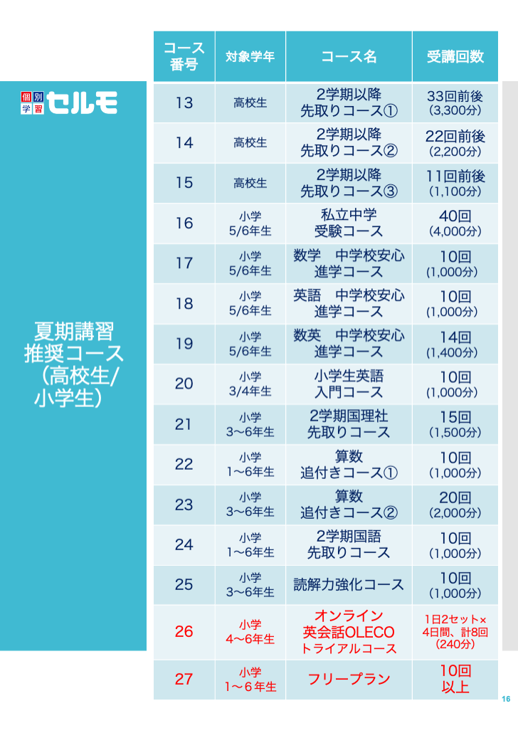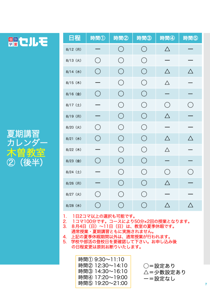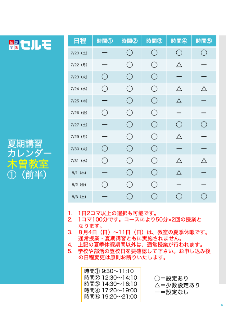 | 備考 : | ―2024年 個別学習のセルモ― ―夏期講習のご案内― セルモの体験や季節講習が初めての方なら、8回800分パックを特別価格で受講可能です! ※小学校1年生〜中学2年生の特別価格 生徒さんの課題に合わせたきめ細やかな全27の推奨コースをご用意しています。 圧倒的演習量で、この夏劇的変化を目指しましょう。 学習量=学力は否定出来ない事実、どなたでも楽しく集中して学習出来る個別学習のセルモが学習課題の解決をお手伝いします!! |