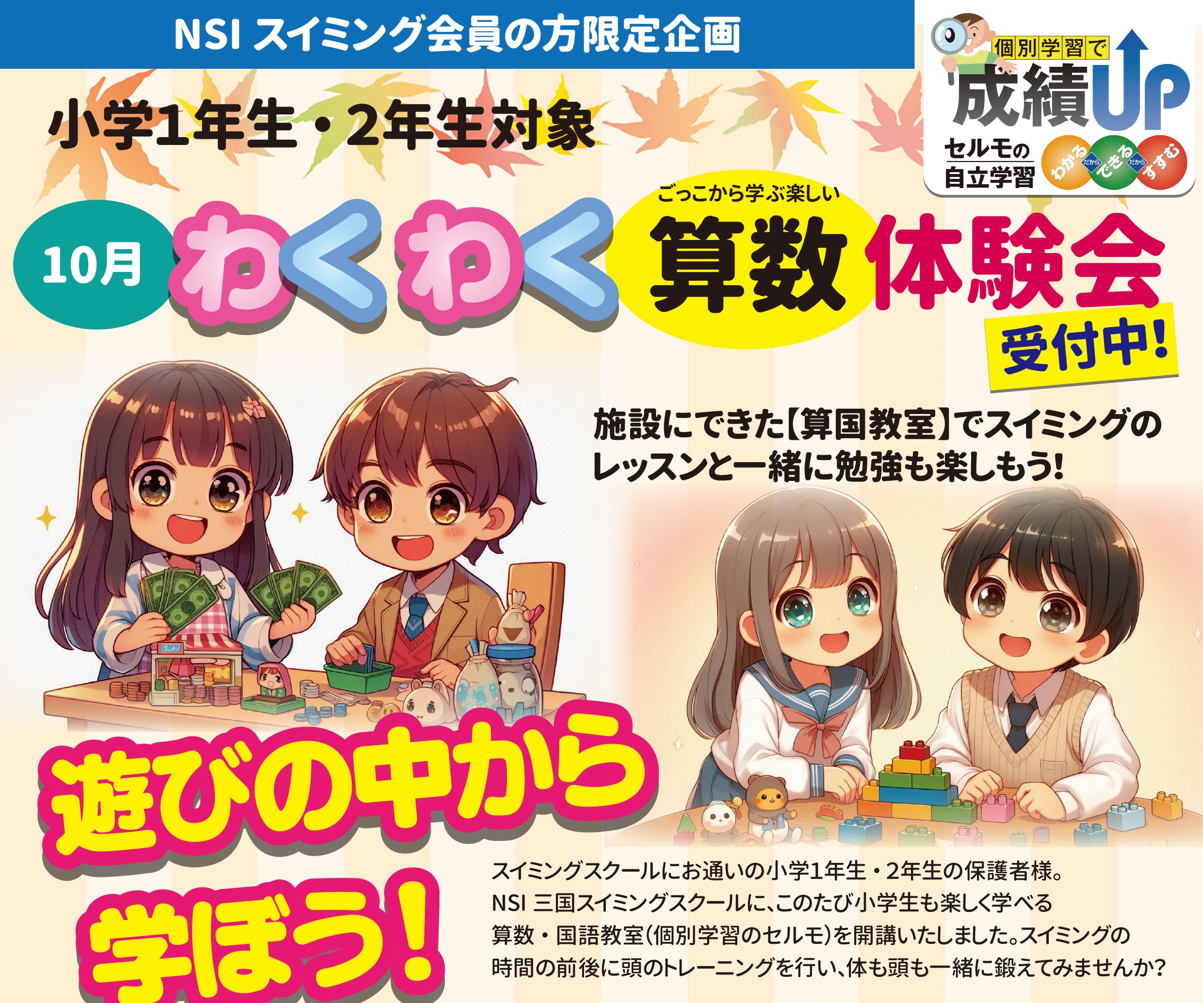 セルモNSI三国教室ではお子さまに、色んな事を通 して学ぶことの楽しさや