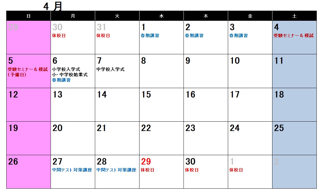 ※土・日と年度替わりの休み(3/28-31)は休校を予定
