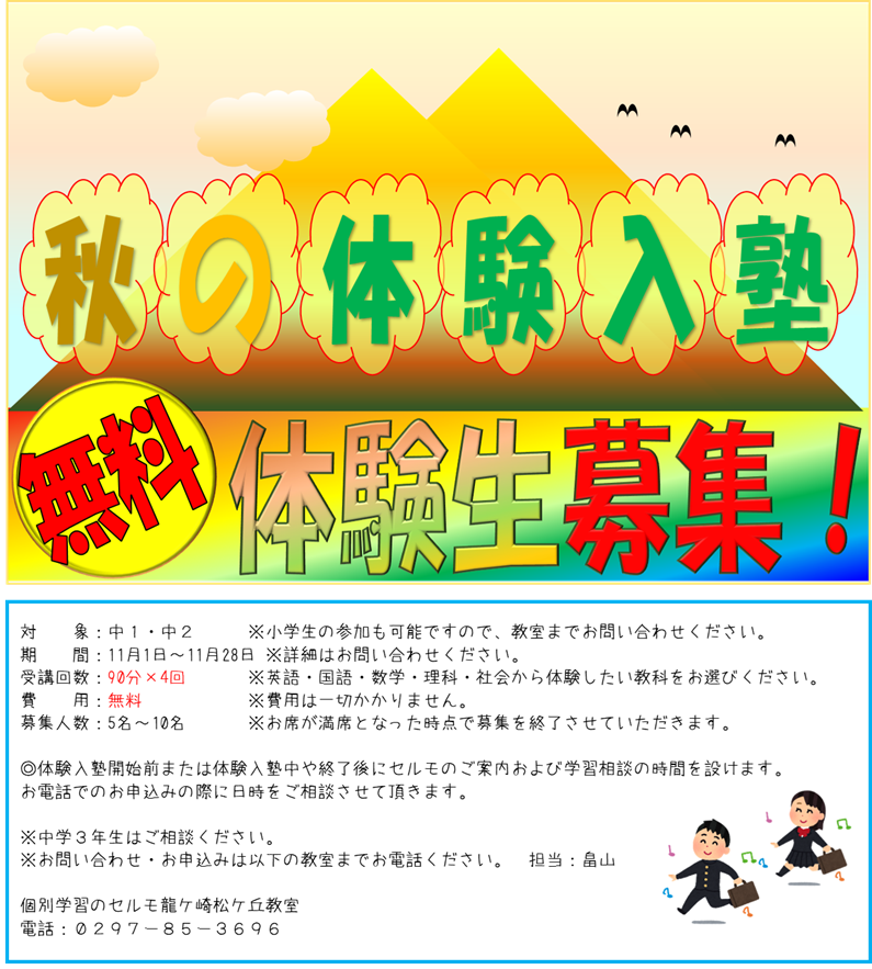 これまでセルモでは5教科の合計が50点前後の成績から竜ヶ崎南、江戸崎総合の合格へ導いたり、同100点前後の成績から竜ヶ崎二高、取手二高の合格へ導いたりと数多くの実績があり、そのためのノウハウも蓄積しております。(ホームページ下方の「セルモ生の進学先情報」をご参照ください)成績不振で高校受験に大きな不安を抱えていらっしゃるのであれば、是非、セルモにご相談ください。お悩みを共有し、親身にご協力させて頂きます。
