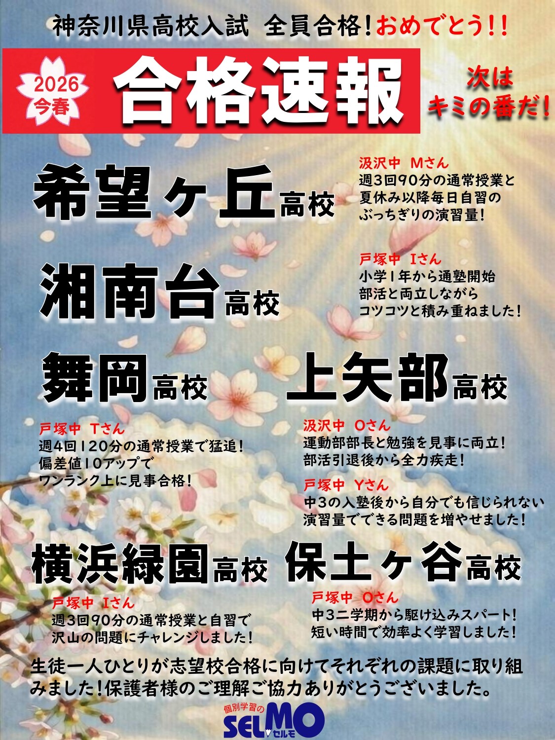 | 営業時間 : | 月曜日~金曜日 14:00~21:00 土曜日 不定期開校 日曜 戸塚中学校/汲沢中学校定期テスト前は開校 |