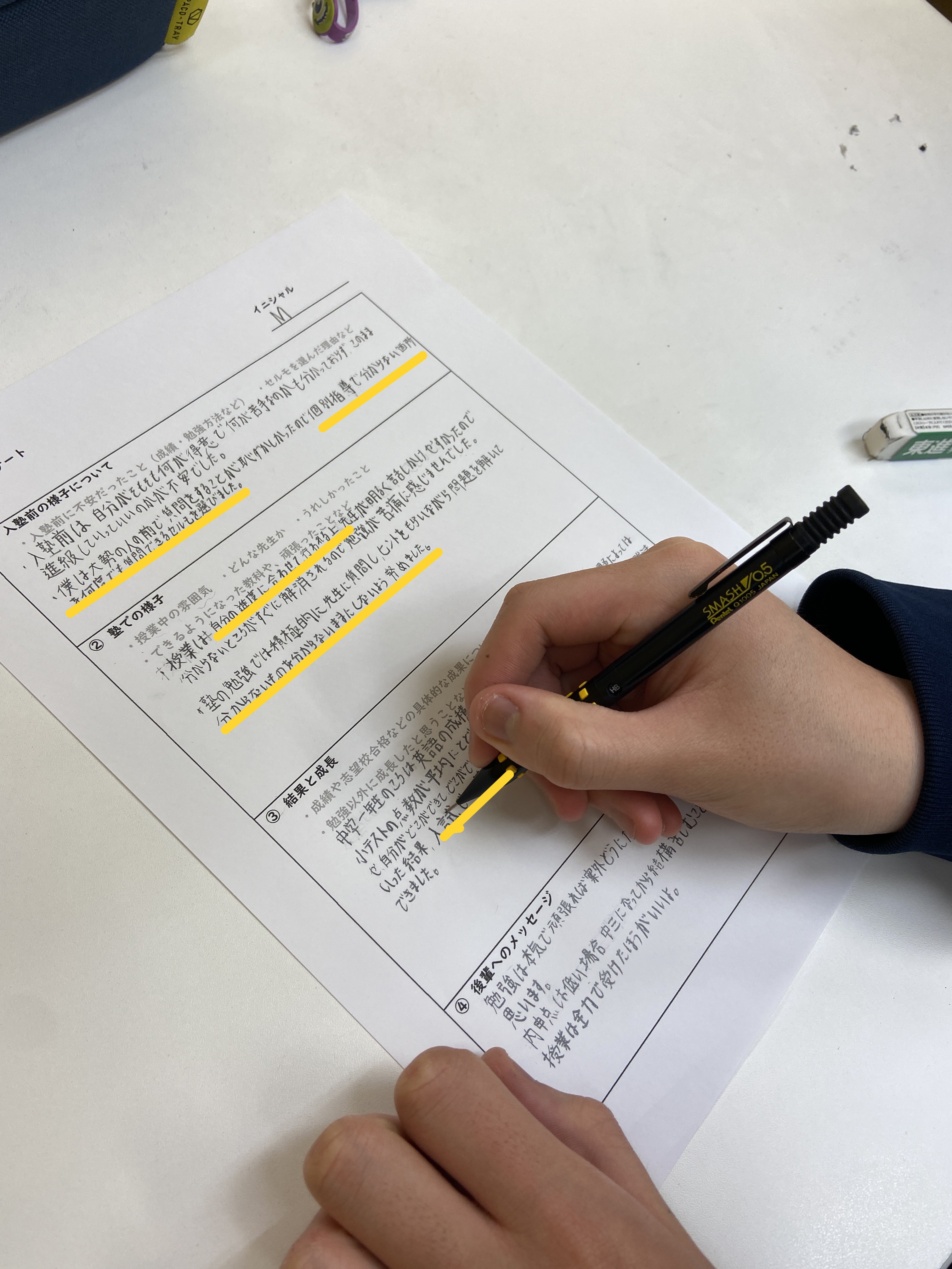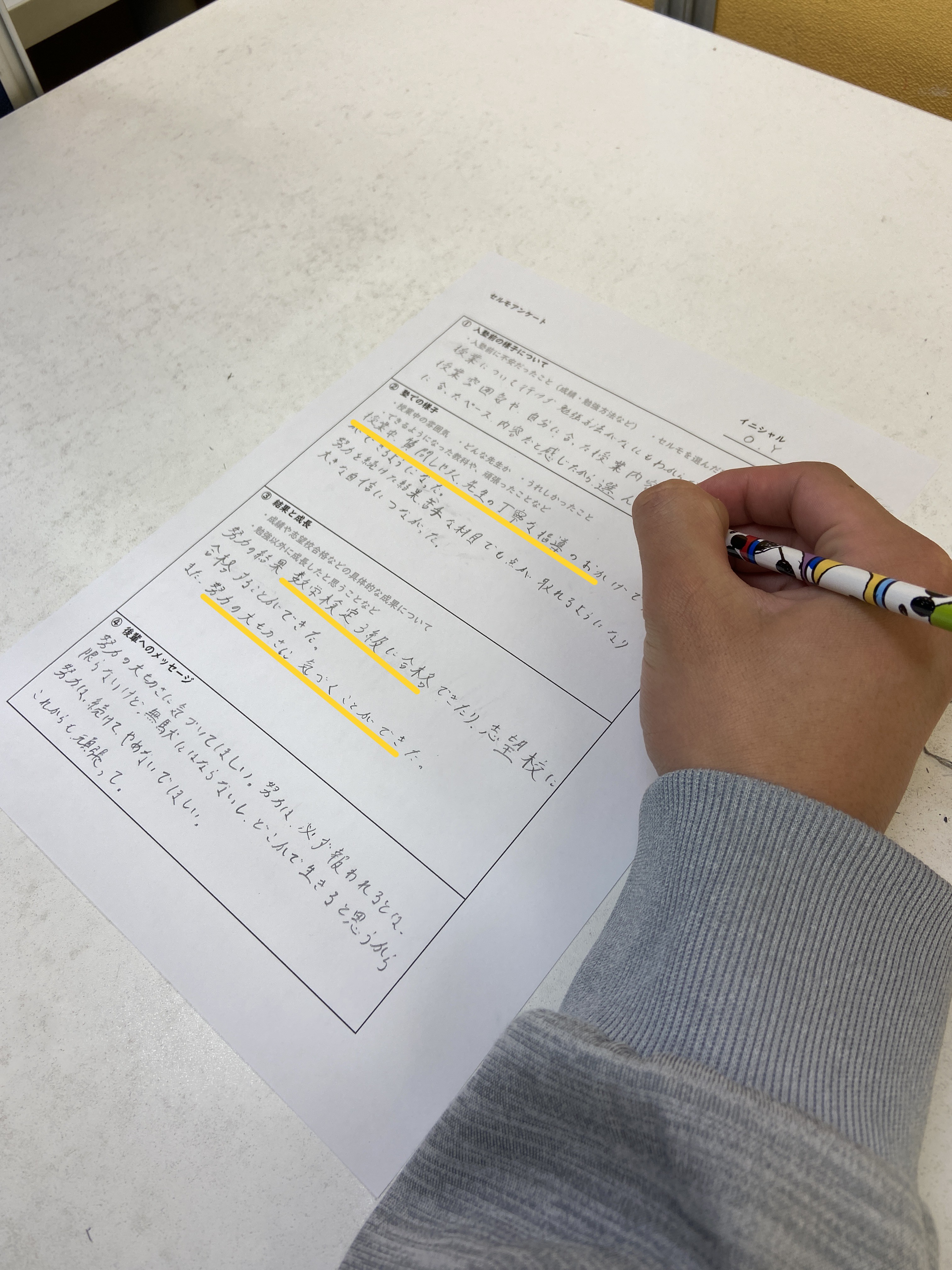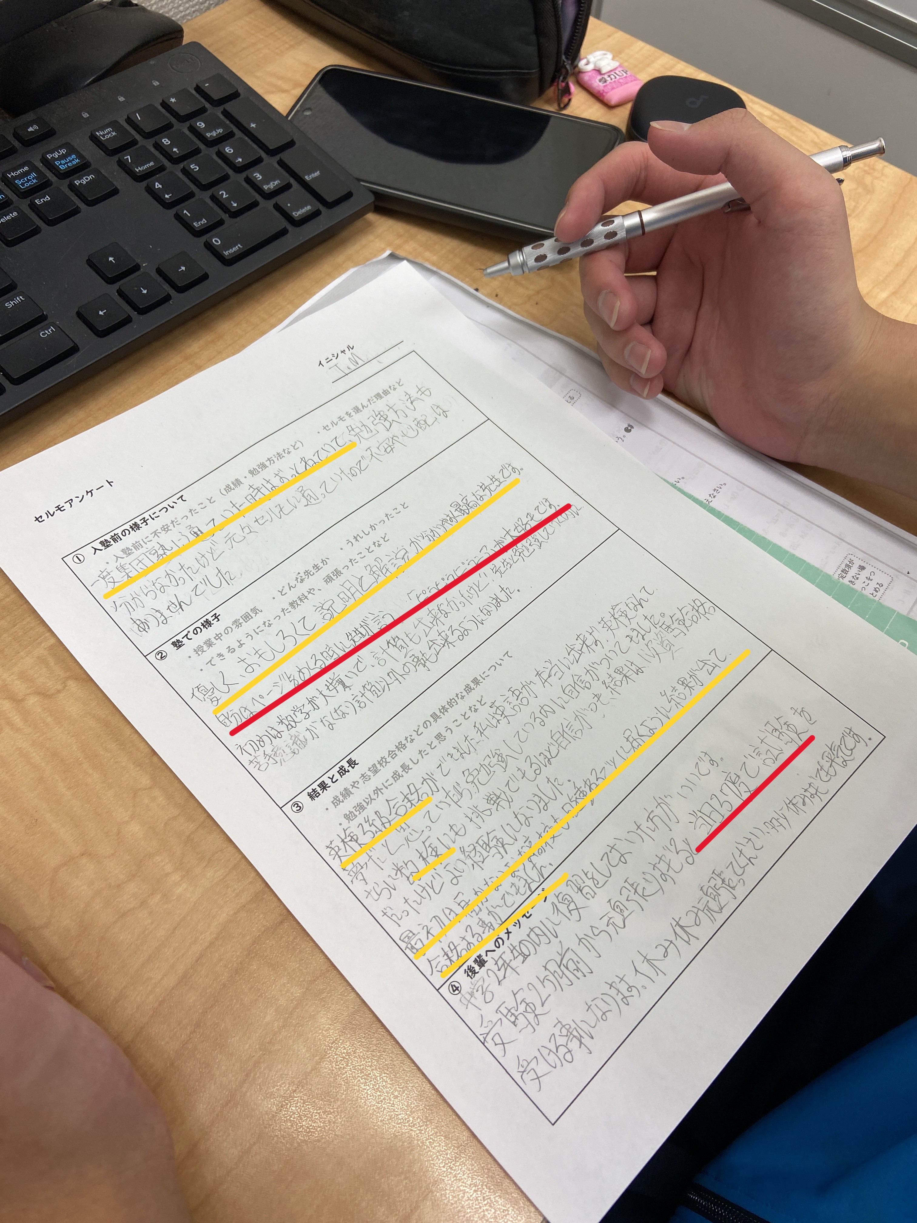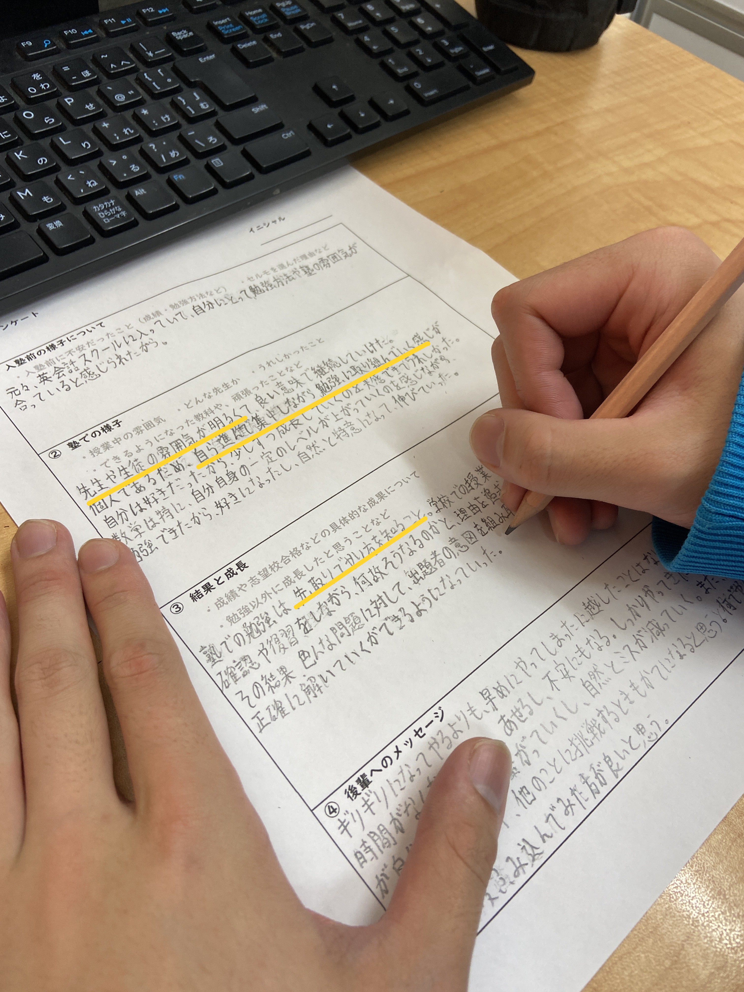 〇入塾当初の中1の時はテスト前でもあまり自習に来てくれませんでしたが、学年が上がり内申点や模試の偏差値など受験を意識するようになると、毎日のように自習に来てくれるようになりました。演習量が増えるとできる問題も増えて点数も上がってきました。やればできると自信になったと思います。私の反省としてはギャグがすべらないように精進しますね!