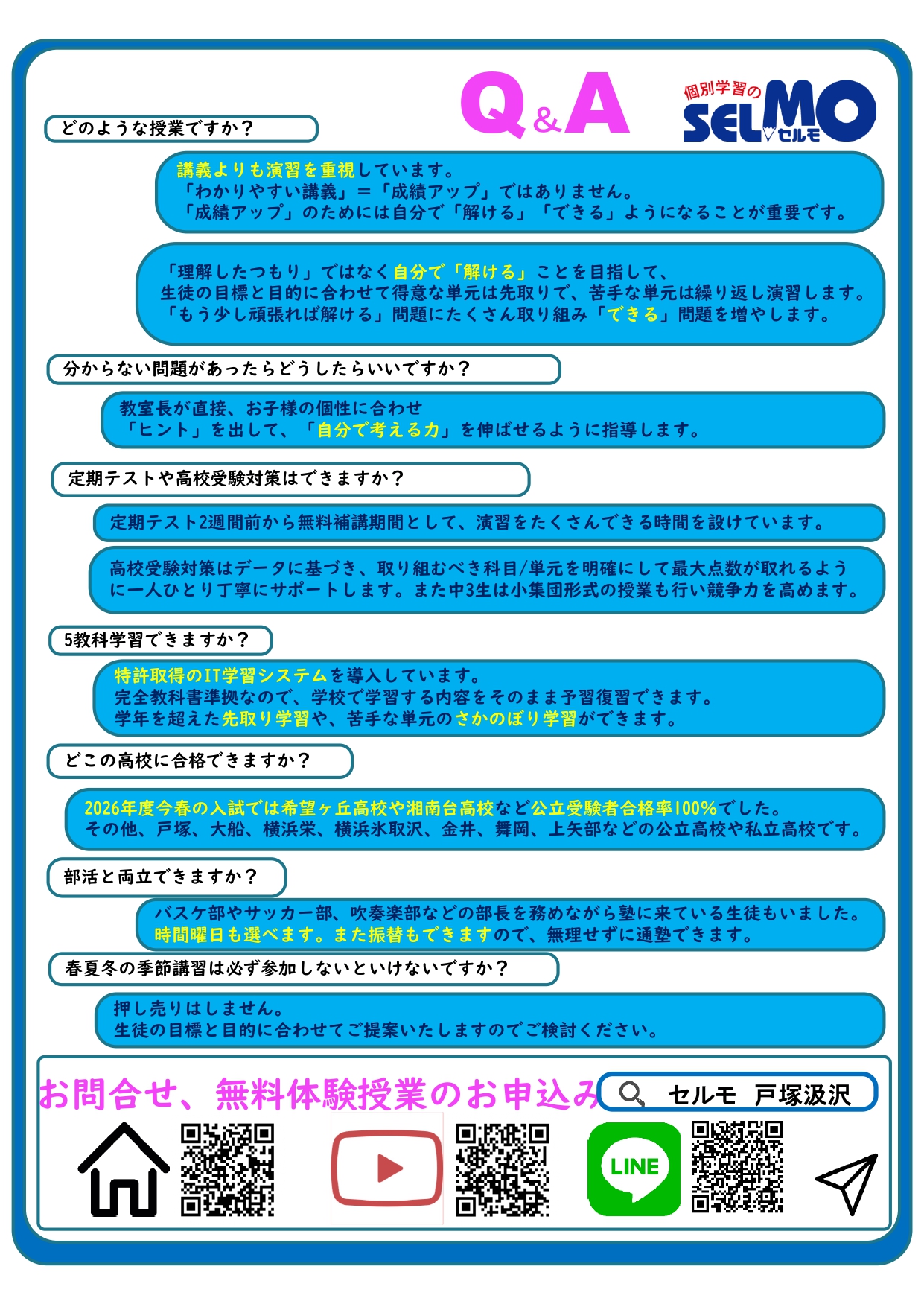 セルモ戸塚汲沢教室は、塾で問題演習を管理することが大切だと考え、演習重視の授業を行っています。また、楽しく通ってもらいたいと考えています。生徒のみんなとコミュニケーションをとることで勉強へ入りやすくし、勉強の習慣づけをしていきます。